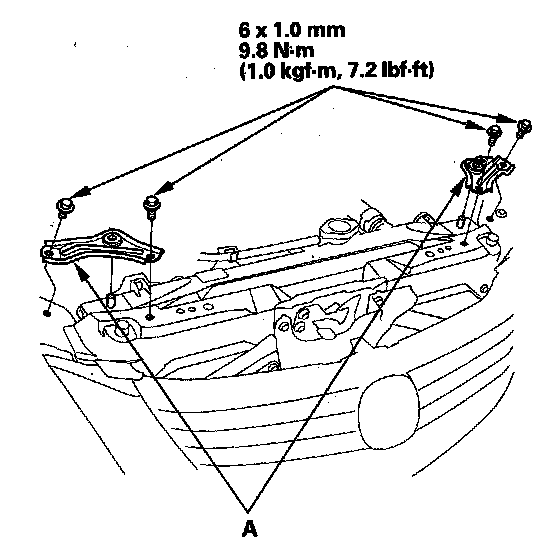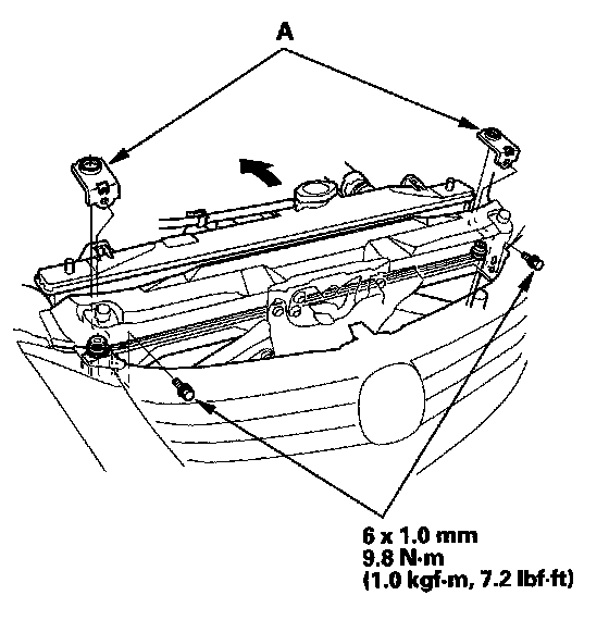 7. Remove the bolts and the radiator upper mount brackets (A).