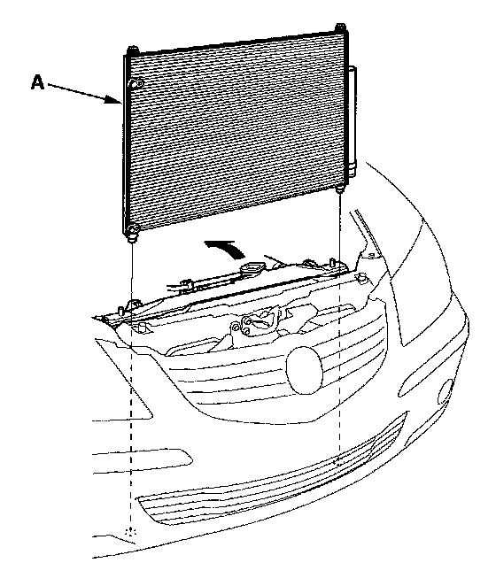10. Remove the A/C condenser (A) by lifting it up. Be careful not to damage the radiator and condenser fins when removing the condenser.