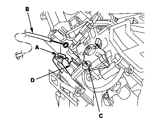 4. Attach the heater valve cable (B) to the air mix control linkage (C) as shown in step 2. Hold the end of the heater valve cable housing against the stop (D), then snap the heater valve cable housing into the cable clamp (A).