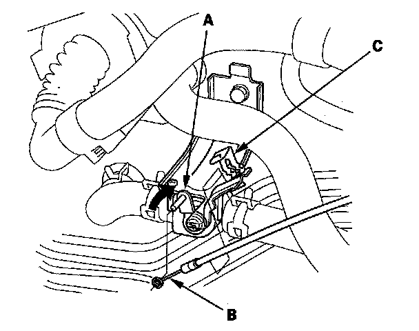 5. From under the hood, turn the heater valve arm (A) to the fully closed position as shown, and hold it. Attach the heater valve cable (B) to the heater valve arm, and gently pull on the heater valve cable housing to take up any slack, then install the heater valve cable housing into the cable clamp (C).