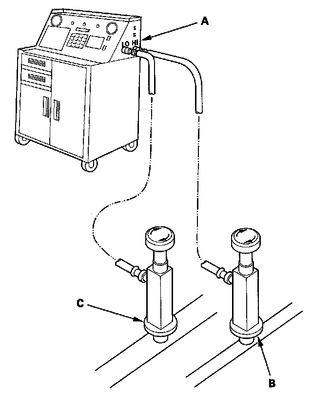 2. Connect an R-134a refrigerant recovery/recycling/charging station (A) to the high-pressure service port (B) and the low-pressure service port (C), as shown, following the equipment manufacturer's instructions. Evacuate the system.