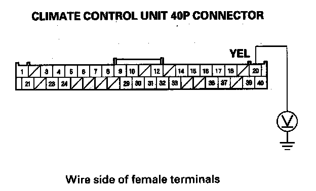 4. Measure the voltage between the climate control unit 40P connector No. 20 terminal and body ground.