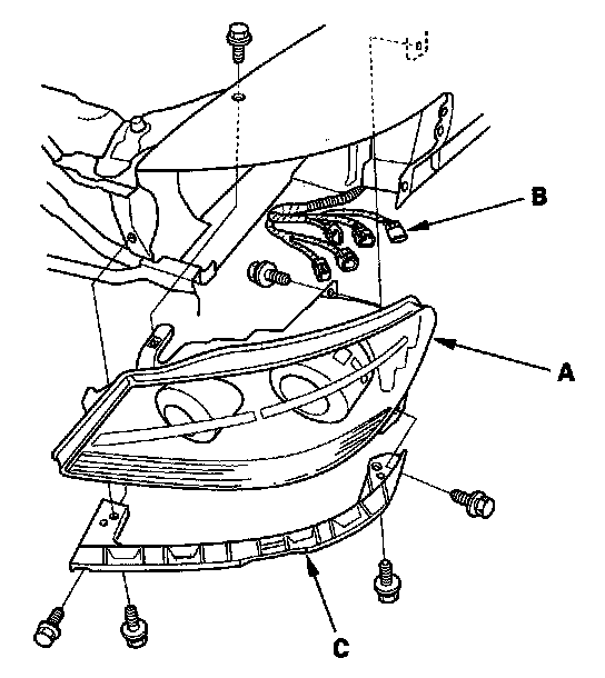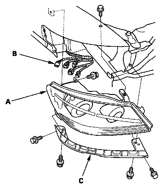 5. Remove the two bolts and the corner upper beam (C) from the headlight.