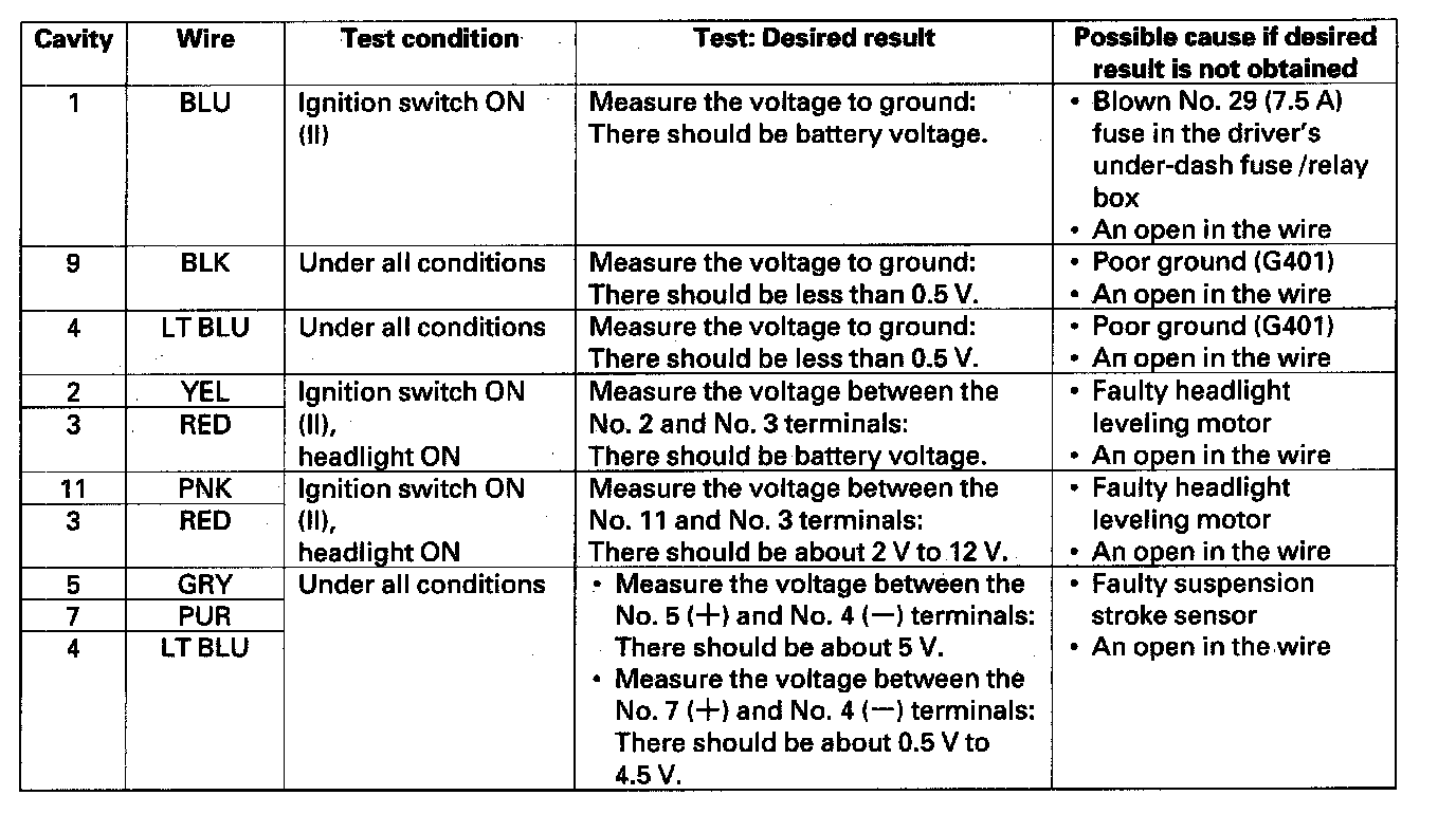 Headlight Leveling Control Unit Input Test1. Turn the ignition switch OFF, remove the driver's dashboard undercover, and the driver's dashboard lower cover.