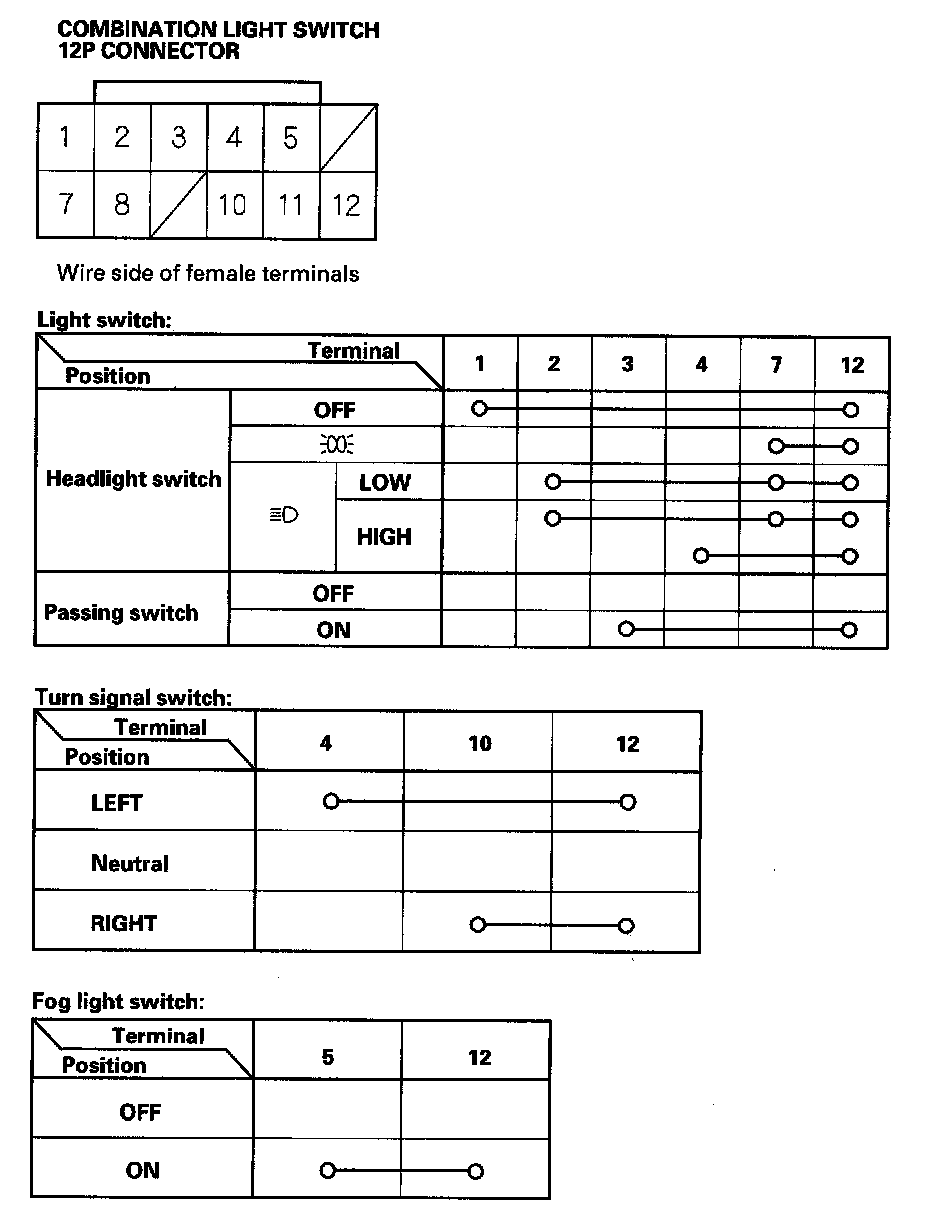 - If the terminals look OK, check for continuity between the terminals in each switch position according to the tables.