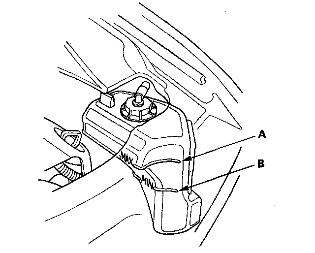 Coolant Check1. Look at the coolant level in the coolant reservoir. Make sure it is between the MAX mark (A) and MIN mark (B).