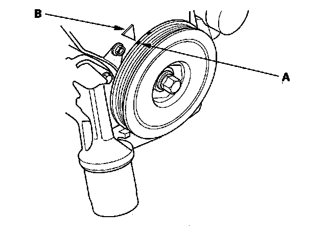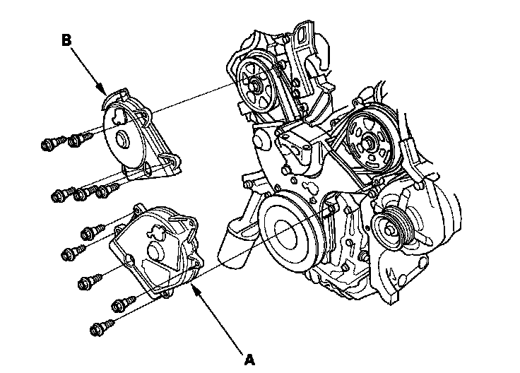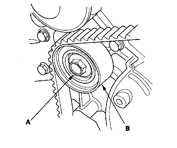 16. Remove the idler pulley bolt (A) and idler pulley (B), then remove the timing belt. Discard the idler pulley bolt.