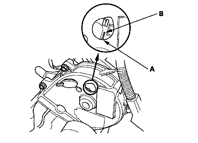 2. Turn the crankshaft so its white mark (A) lines up with the pointer (B).