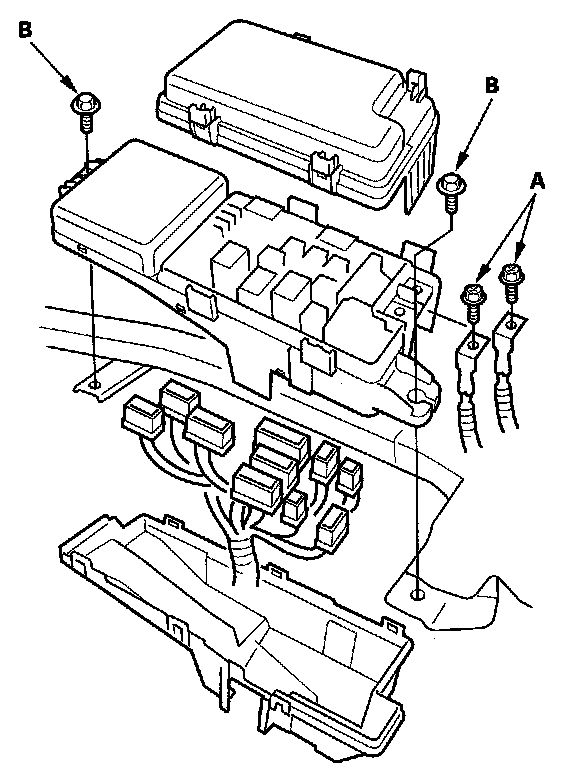4. Remove the two mounting bolts (B) from the under-hood fuse/relay box.