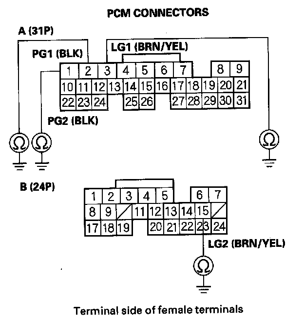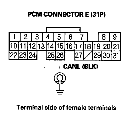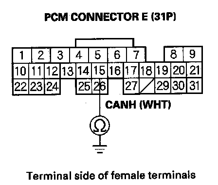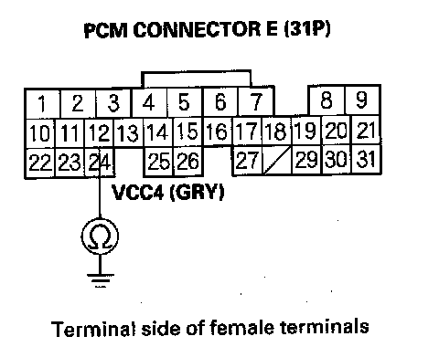 34. Check for continuity between PCM connector terminal E26 and body ground.