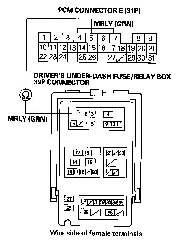 58. Check for continuity between PCM connector terminal E5 and driver's under-dash fuse/relay box 39P connector terminal No. 1.