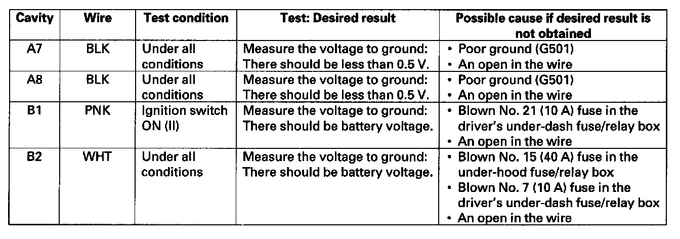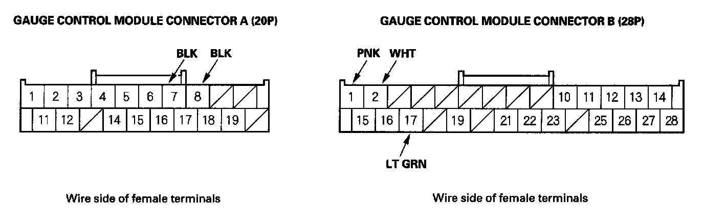 6. Disconnect the A (20P) and B (28P) connectors from the gauge control module, and make these input tests at the connector.