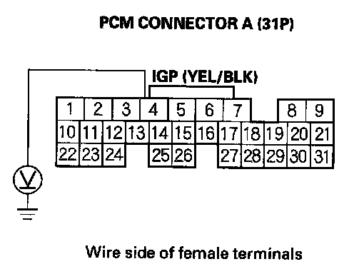 32. Measure voltage between PCM connector terminal D6 and body ground.