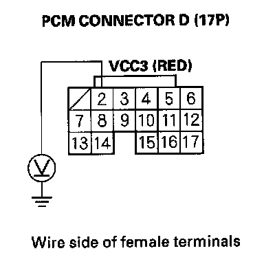 61. Disconnect the connector from each of the following sensors, one at a time, while measuring voltage between body ground and PCM connector terminal C14 with the ignition switch ON (II).