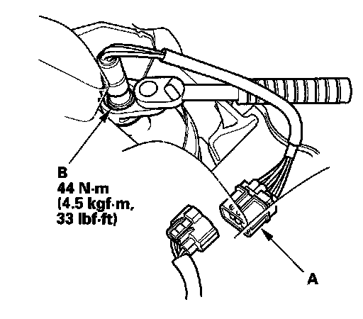 1. Disconnect the front A/F sensor 8P connector (A), then remove the A/F sensor (B) with an O2 sensor socket wrench.