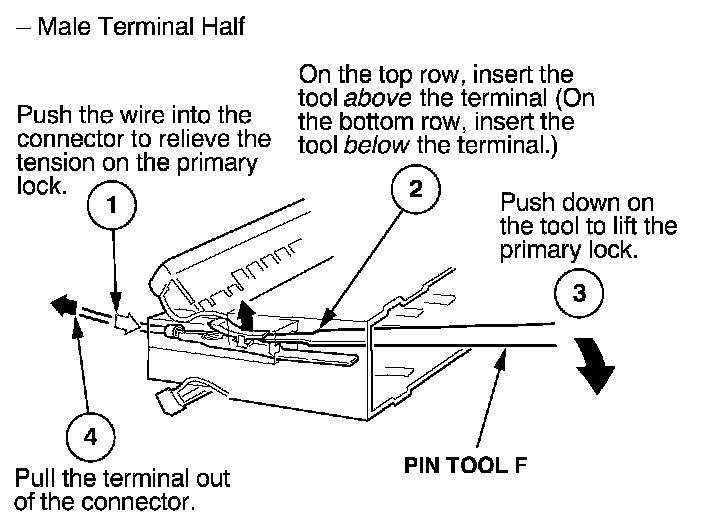 Before you begin, inspect the wire you are about to repair for damage and length. Make sure the wire will be long enough to make a terminal repair without stretching it when you reinstall the terminal in the connector. If the wire is too short, or if access to the connector is too restricted to make a terminal repair, you may need to install a pigtail terminal (a short length of wire with a factory-crimped terminal on it). Refer to HOW TO INSTALL PIGTAIL TERMINALS.