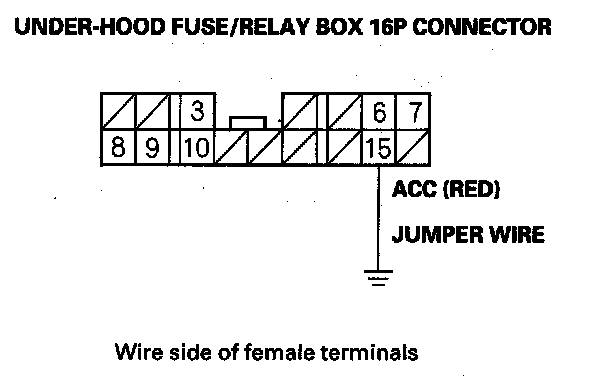 9. Momentarily connect under-hood fuse/relay box 16P connector terminal No. 15 to body ground with a jumper wire several times.