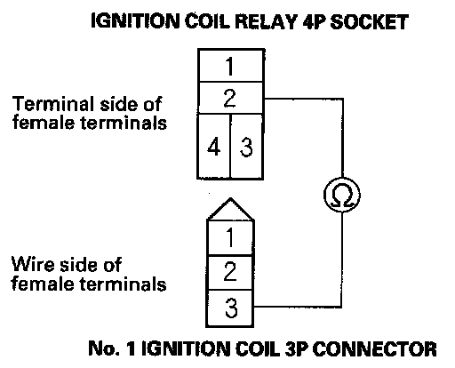 4. Check for continuity between ignition coil relay 4P socket terminal No. 2 and the No. 1 ignition coil 3P connector terminal No. 3.