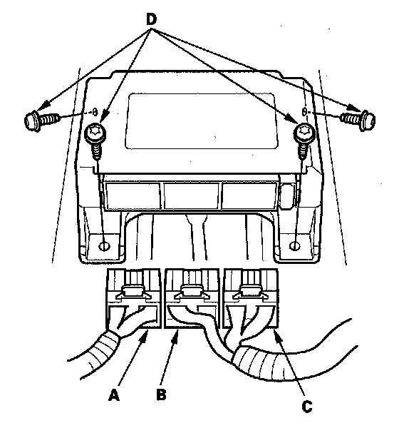 6. Disconnect SRS unit connector A (28P), SRS unit connector B (28P), SRS unit connector C (28P), and remove the TORX bolts (D), then pull out the SRS unit.
