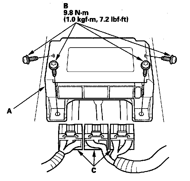 1. Install the new SRS unit (A) with the TORX bolts (B), then connect the connectors (C) to the SRS unit; push them into position until they click.