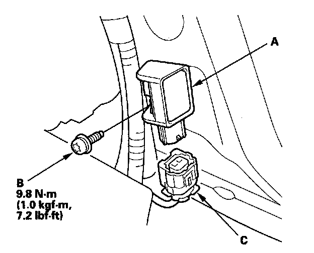 1. Install the new side impact sensor (first) (A) with the TORX bolt (B), then connect the floor wire harness 2P connector (C) to the side impact sensor (first).