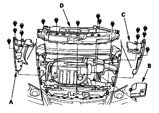 2. Remove the right upper fender trim (A), battery trim (B), left upper fender trim (C), then remove the upper grille cover (D).