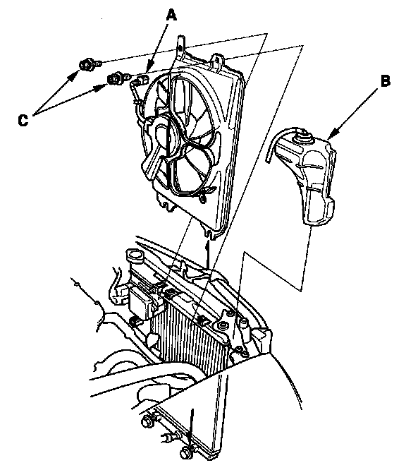 10. Remove the two bolts (C), then remove the A/C condenser fan shroud.