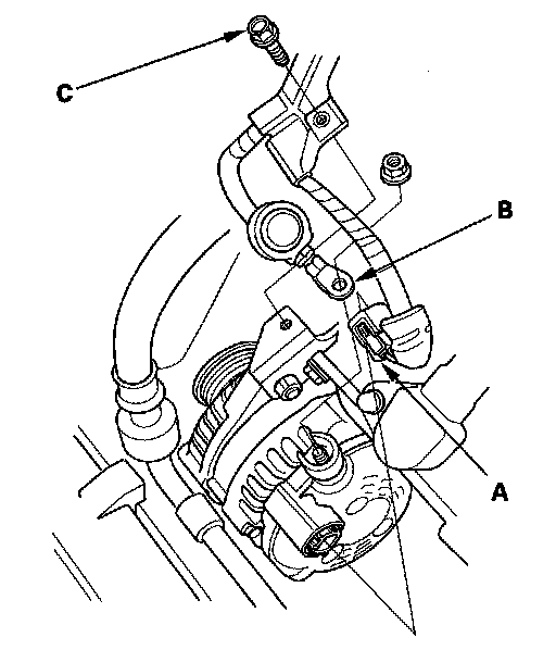 7. Loosen the two bolts (C) securing the A/C condenser fan shroud.