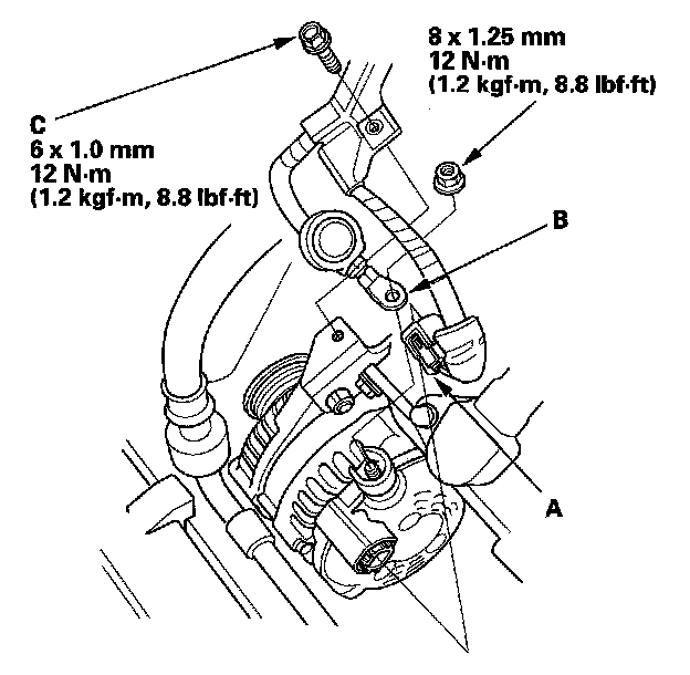 14. Remove the mounting bolt (A) and alternator bracket mounting bolt (B), then remove the alternator.