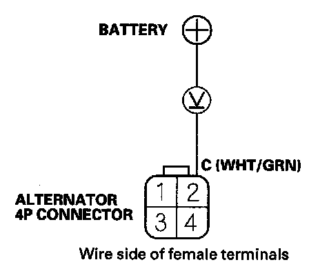 4. Measure the voltage between alternator 4P connector terminal No. 2 and the positive terminal of the battery.