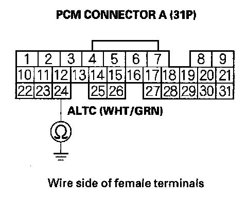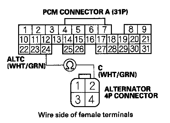 10. Check for continuity between PCM connector terminal A24 and alternator 4P connector terminal No. 2.