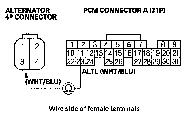 18. Check for continuity between PCM connector terminal A11 and alternator 4P connector terminal No. 3.