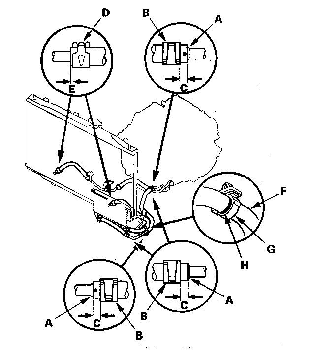 4. Install the ATF cooler hose (F) on the clamp (G) at the mark (H).
