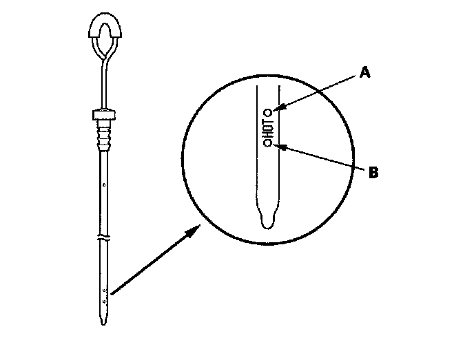 5. Remove the dipstick and check the fluid level. It should be between the upper mark (A) and lower mark (B).