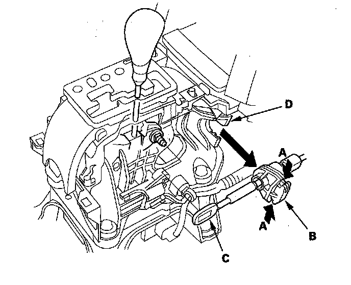 5. Press the holder lock release (A), and pull out the socket holder (B) to remove the shift cable (C) from the shift lever bracket base (D).