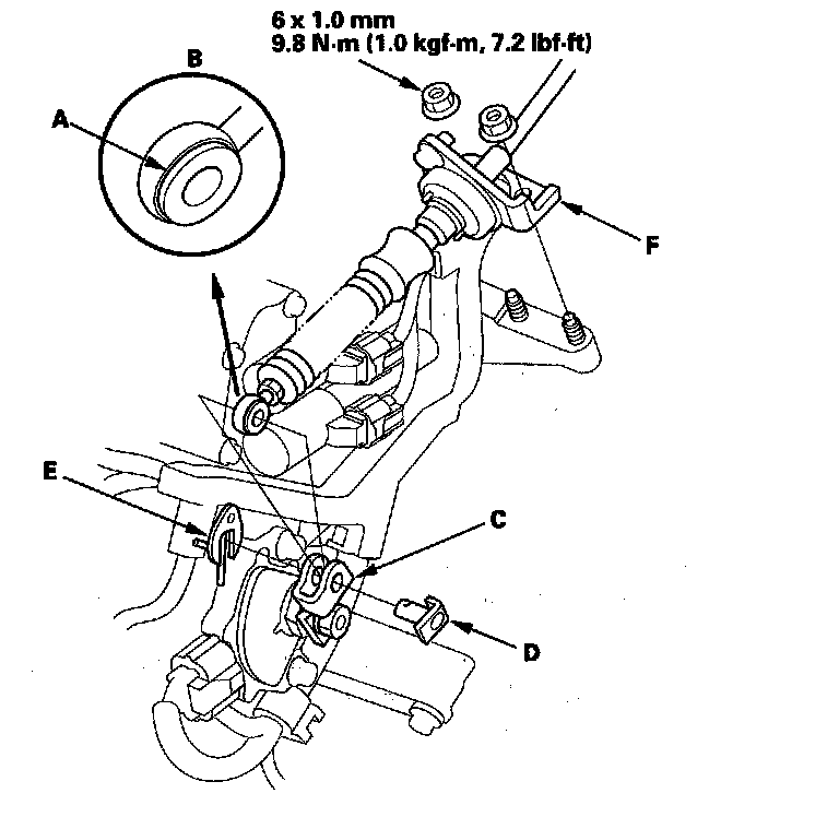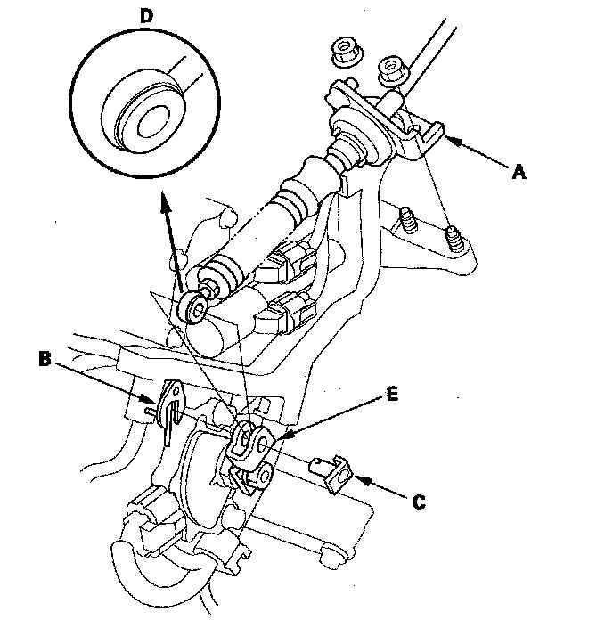 20. Apply molybdenum grease to the hole in the bushing (A) in the shift cable end (B). Attach the shift cable end to the control lever (C), then insert the control pin (D) into the control lever hole through the shift cable end, and secure the control pin with the spring clip/washer (E).