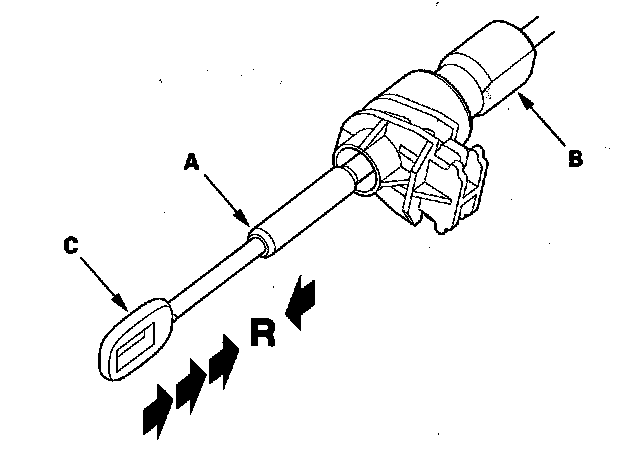 23. If necessary, push the shift cable until it stops, then release it. Pull the shift cable back one step so that the shift position is in R. Do not hold the shift cable guide (A) and damper (B) to adjust the shift cable (C).