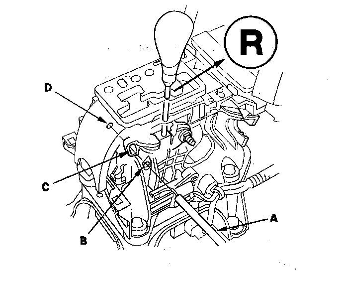 25. Place the shift lever in R, then insert a 6.0 mm (0.24 in.) pin (A) through the positioning hole (B) on the shift lever bracket base, through the positioning hole (C) on the shift lever, and into the positioning hole (D) on the shift lever bracket base. The shift lever is secured in R.