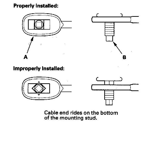 27. Check that the shift cable end (A) is properly installed on the mounting stud (B).