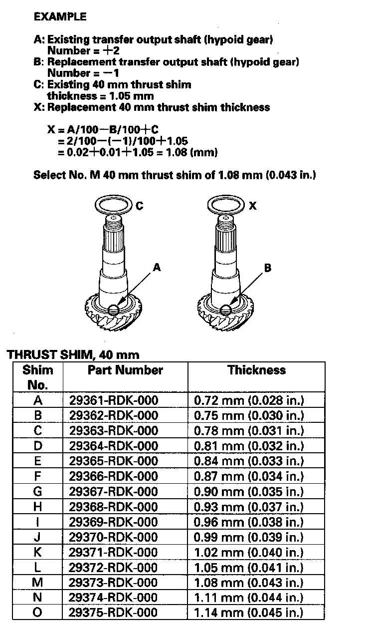 1. Select the 40 mm thrust shim if the transfer output shaft (hypoid gear) is replaced. Calculate the thickness of the 40 mm thrust shim using the following formula, and select the shim from the following table.