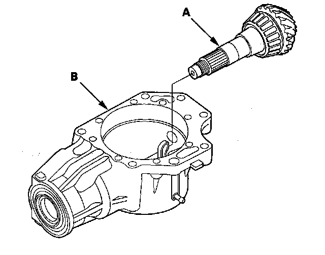 6. Install the transfer output shaft (hypoid gear) (A) in the transfer housing (B). Do not install the transfer spacer and thrust washer on the transfer output shaft (hypoid gear).