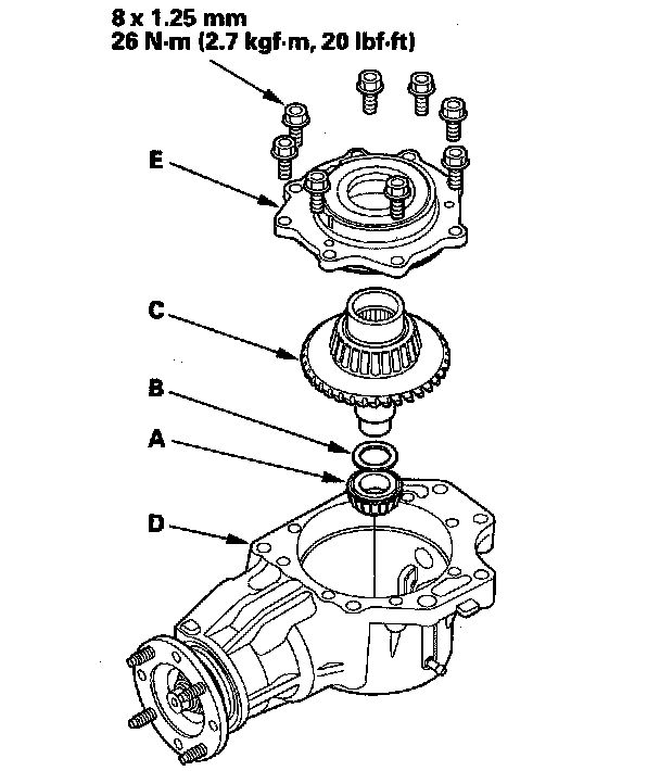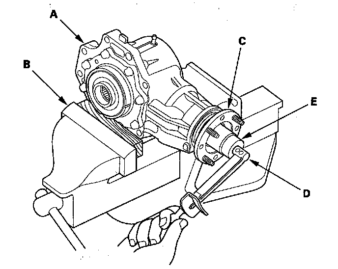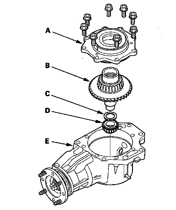 21. Remove the transfer cover (A), transfer hypoid drive gear/shaft assembly (B), 25 mm thrust shim (C), and tapered roller bearing (D) from the transfer housing (E) after adjusting the transfer gear backlash or transfer gear tooth contact.