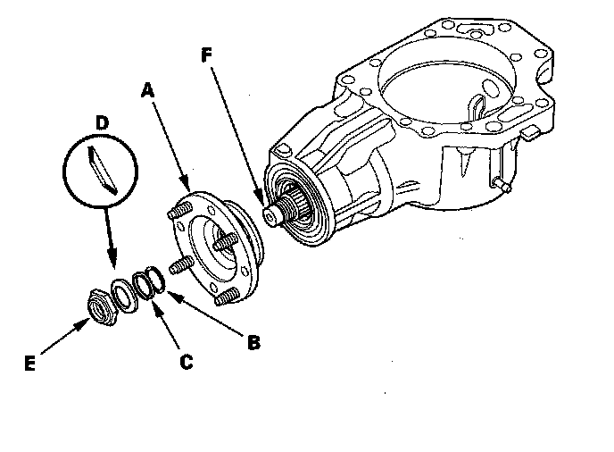 29. Install the companion flange (A). Coat a new O-ring (B) with transfer fluid (hypoid gear oil), then install the O-ring, back-up ring (C), new conical spring washer (D), and new locknut (E) on the transfer output shaft (hypoid gear) (F). Install the conical spring washer in the direction shown.