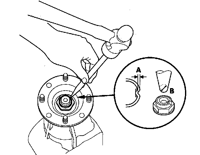 34. Stake the locknut to a depth (A) of 0.7 - 1.2 mm (0.03 - 0.05 in.) using a 3.5 mm punch (B).
