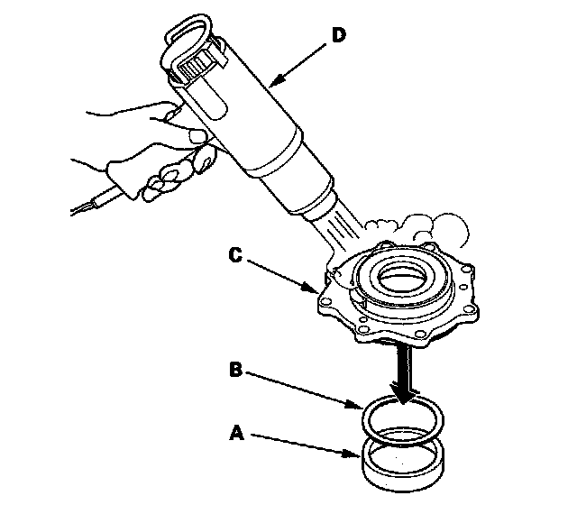 7. Install the companion flange (A), conical spring washer (B) (in the direction shown), and locknut (C) on the transfer output shaft (hypoid gear) (D). Do not install the O-ring and back-up ring.