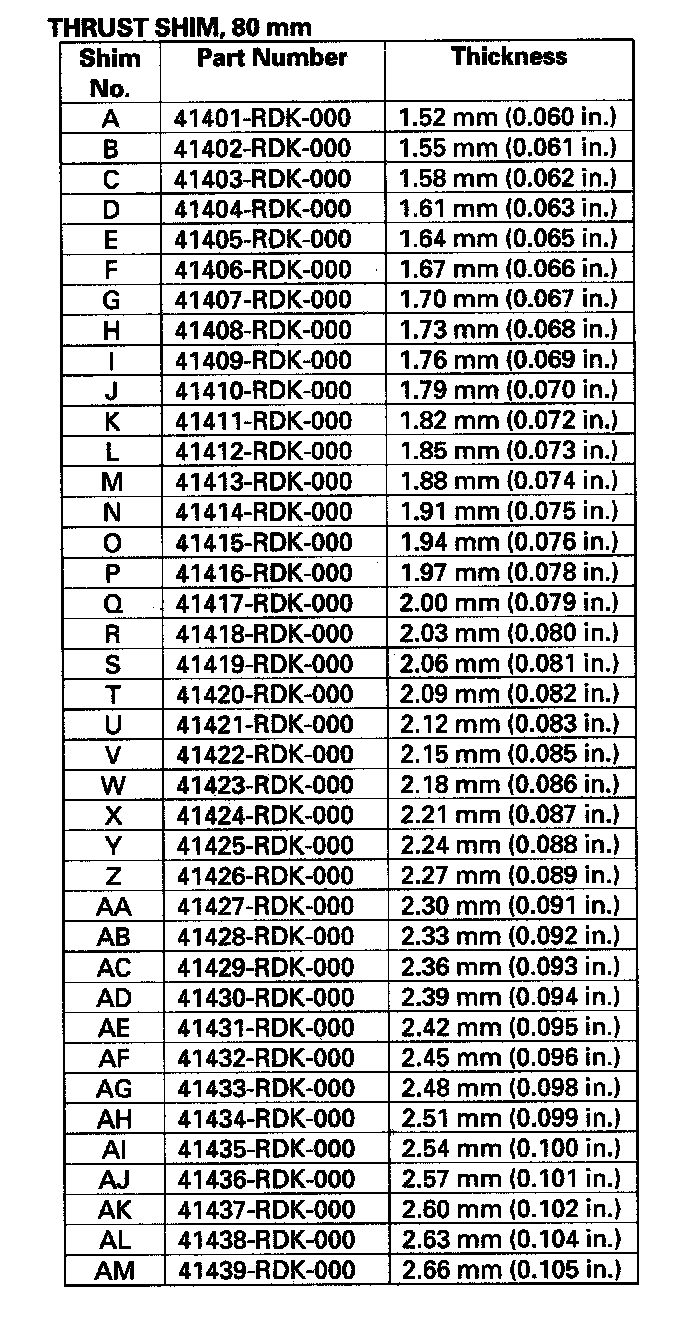 43. Measure thickness of the removed 80 mm thrust shim, and select the new 80 mm shim.