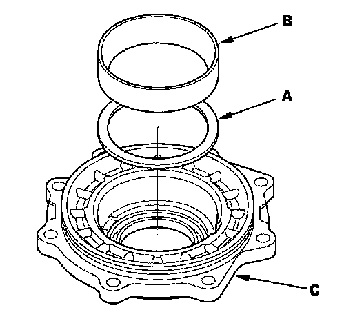 44. Install the 80 mm trust shim (A) and the bearing outer race (B) in the transfer cover (C). If you heated the cover, let it cool to room temperature before installing the thrust shim.