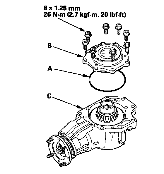 47. Install the new O-ring (A) on the transfer cover (B), then install the cover on the transfer housing (C).