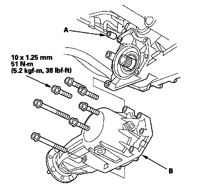 2. Install the dowel pin (A) in the transmission, and install the transfer assembly (B) on the transmission.