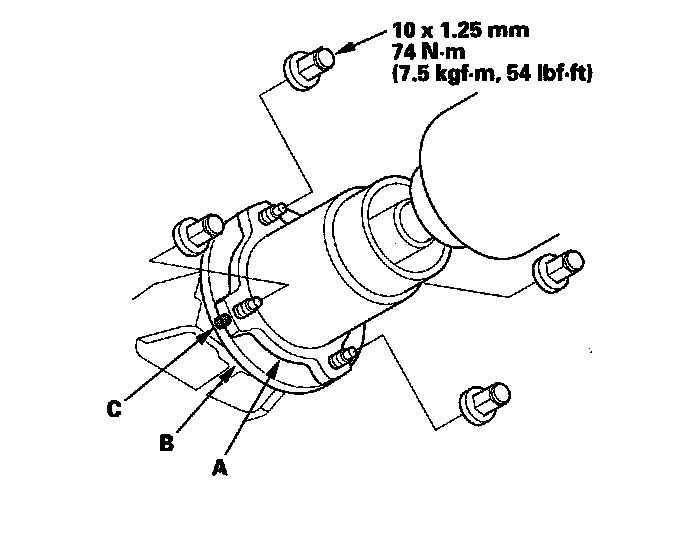 5. Install exhaust pipe A with the new self-locking nuts and new gaskets (B) (C).